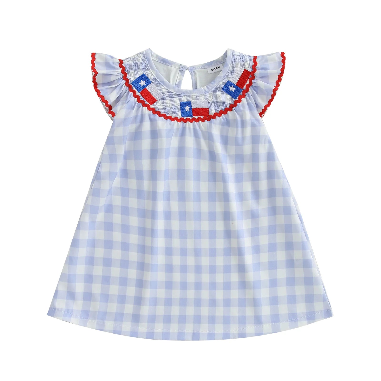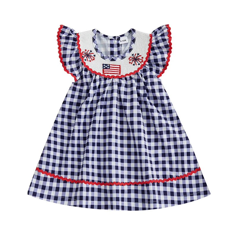 Independence Day Toddler Girl Dress with Plaid Design American Flag Embroidery Loose Fit and Smocked Crew Neck for a