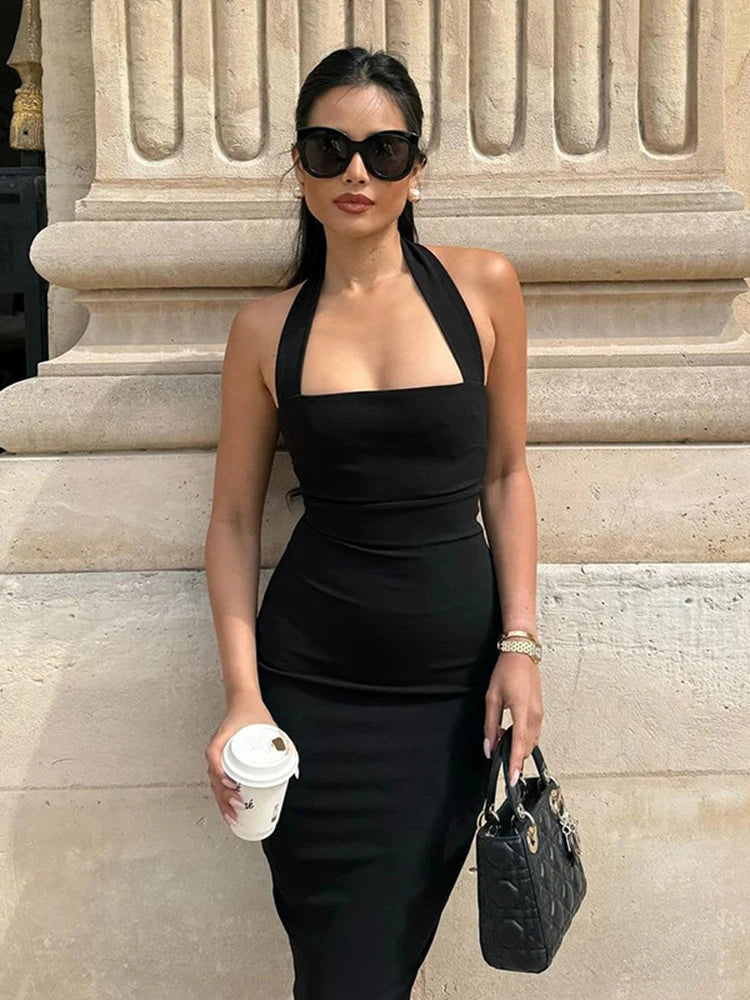 Hugcitar 2025 Elegant Halter Black Backless Sexy Bodycon Maxi Prom Dress Summer Women Y2K Clothes Wedding Birthday Party