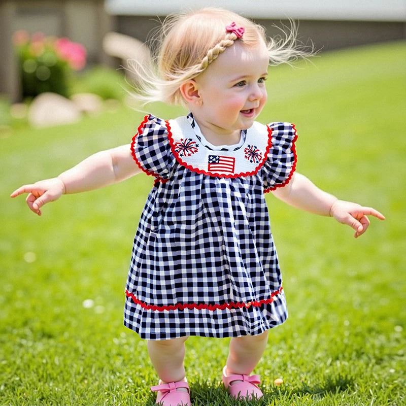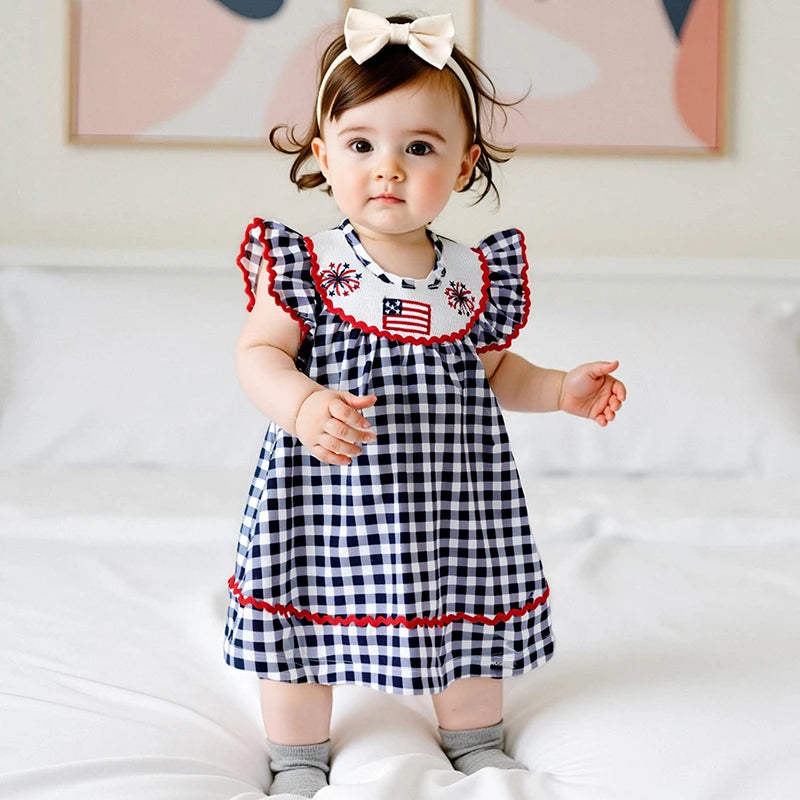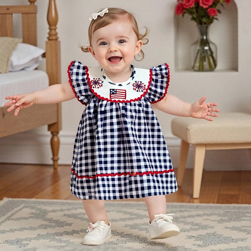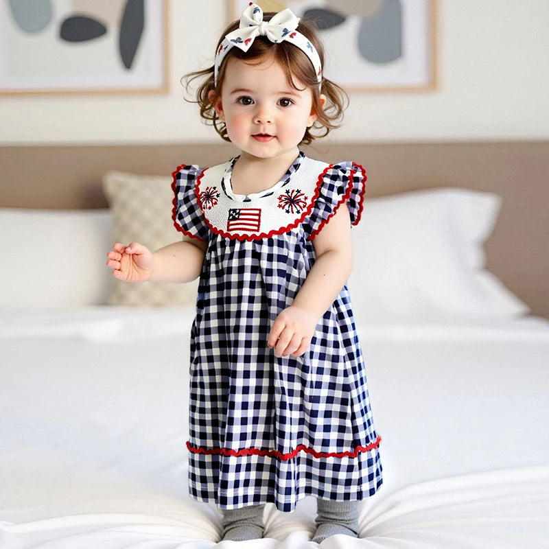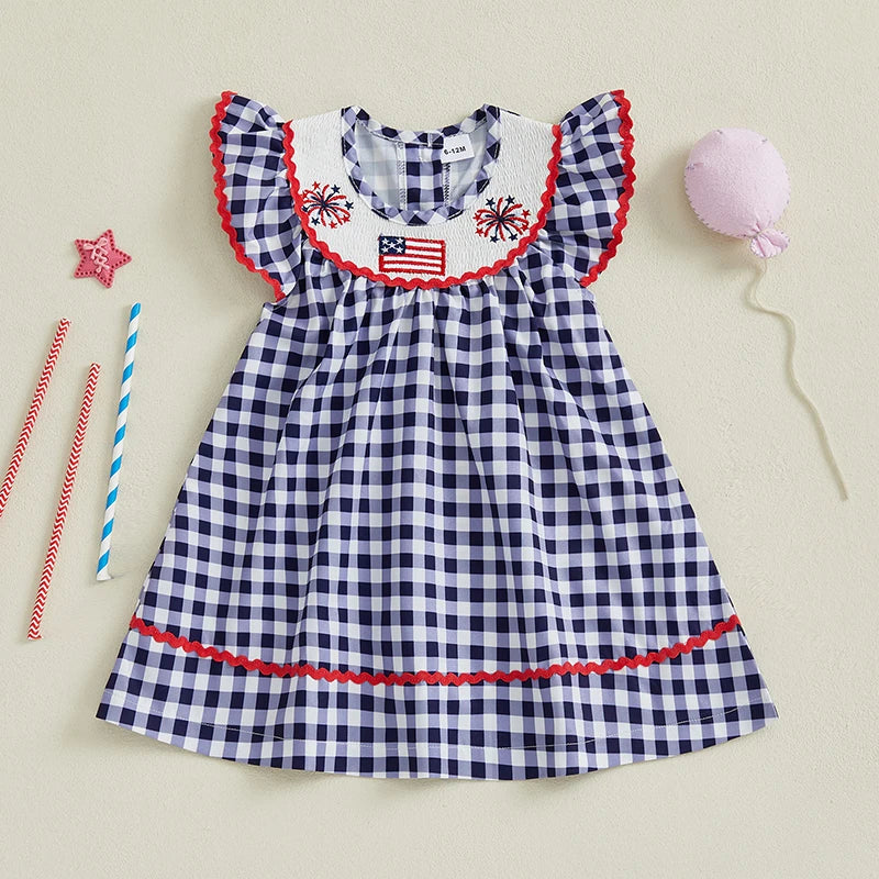 Toddler Girl 4th of July Dress Loose Fit Plaid American Flag Embroidery Smocked Crew Neck Flying Sleeve Dress